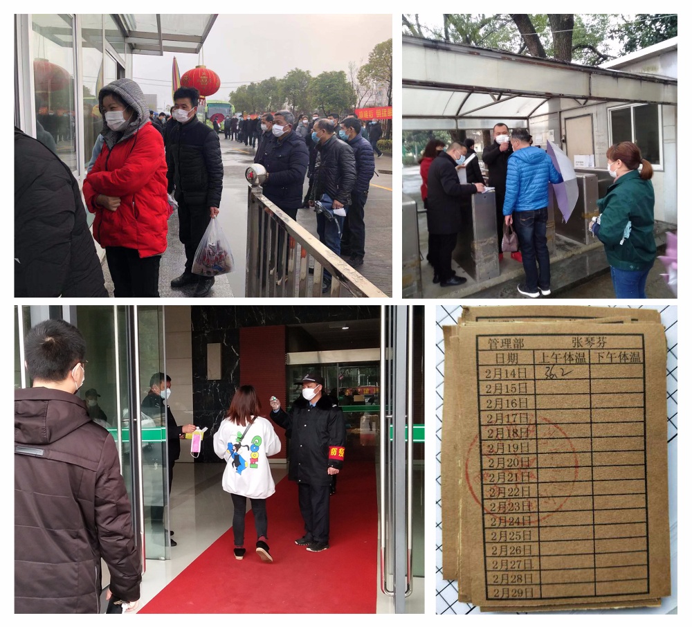 廠門口的員工都戴上口罩,有序排隊,保持1米以上間距,進入公司的每一個都要測量體溫并做好登記,有的子公司還制作了體溫測量小卡片。同時為每位上班員工配發口罩。