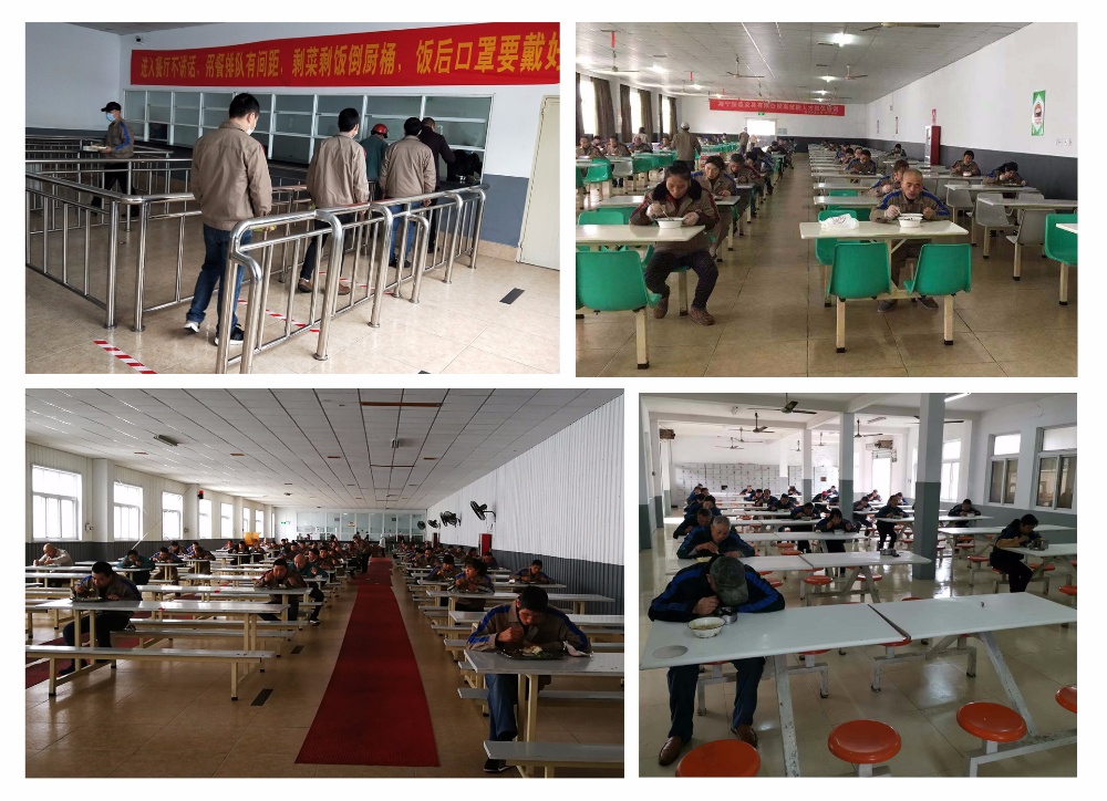 各子公司想方設法進行就餐管理,有的實行車間分餐制和辦公室就餐制,用一次性餐盒送餐到車間或自帶餐具到辦公室就餐,并統一回收;在食堂就餐的,實行錯時就餐,有序排隊領餐,各自分散吃飯,地上有一米線區間標識,桌上也標有座位隔離線,保持一米以上距離,有的一人一桌,禁止互相聊天,提升了文明安全等級。